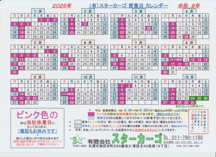 スターカーゴの営業日・営業時間は下記のとおりです。 2026年カレンダーは下の方にあります ↓